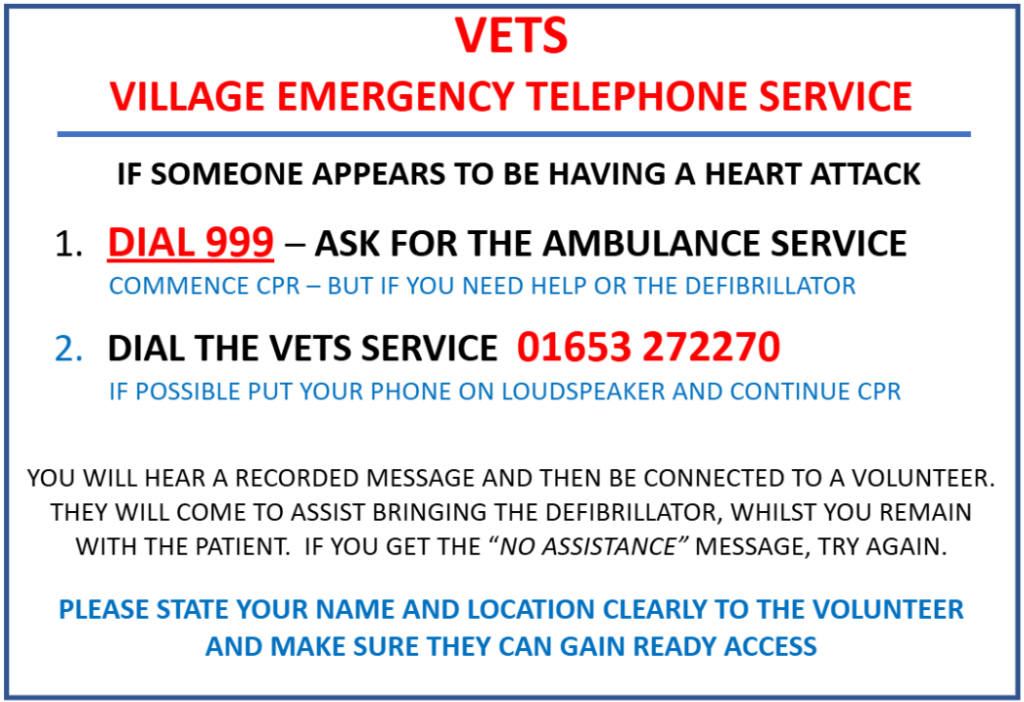 If you call 01653 272270 you will first hear the message “Welcome to VETS. In a moment you will be connected to one of your village helpers. Please state clearly the assistance you require.” Please be patient as it can take time for the call to be answered. Once you have a response you should state your name and location clearly and let the volunteer know how to get into your house (doors unlocked etc). They will then fetch the defibrillator and come to assist you. If you do not get a response within 59 seconds you will hear a “no assistance” message; please try again, especially at night. Please use the loudspeaker on your phone so that you can continue with CPR whilst making the call.